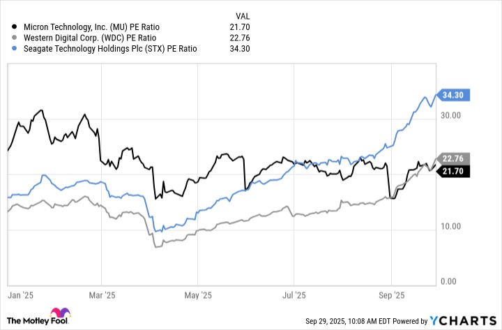 隨着美光今年的強勁反彈,股票現在交易於歷史最高點。提供存儲解決方案的科技公司今年都在上漲,而美光的漲幅實際上落後於 希捷科技(Seagate Technology)和 西部數據(Western Digital),後者今年上漲了約 160%。但由於市盈率較為適中,美光可能在未來成為更具吸引力的投資。