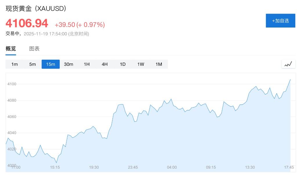 市場趨於謹慎,避險情緒提振黃金走高,現貨黃金漲超 0.9%,重回 4100 美元/盎司上方。