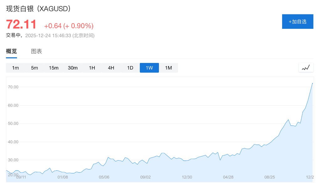 Spot silver rose nearly 1% to $72.11 per ounce, with the price increase logic of silver combining both investment demand and industrial demand as dual drivers.