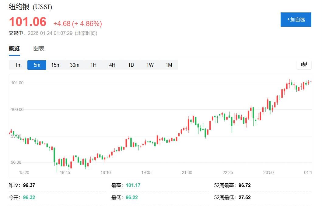 On Friday, the main contract for New York silver, COMEX March silver futures, broke above $101.10 per ounce towards the end of early U.S. stock trading, rising nearly 5% during the day. Spot silver also rose in tandem, reaching above $100.90, with an intraday increase of nearly 4.9%, and both futures and spot silver set intraday historical highs for two consecutive days. Silver futures are expected to accumulate over 10% for the second consecutive week, having risen over 40% year-to-date.