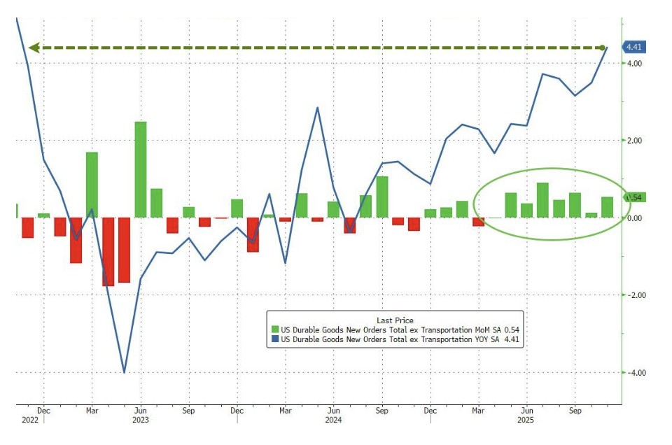 剔除運輸類別的核心訂單環比上漲 0.5%,亦超出預期。這已是該指標連續第八個月實現增長,推動整體設備投資同比增幅達到 4.4%,創下自 2022 年 10 月以來的最高水平。