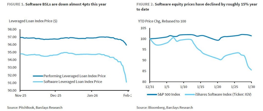 不同於去年 11 月市場對次貸風險的普遍擔憂,今天的拋售反映了對 “軟件行業被 AI 壓垮” 的深度焦慮。上週,廣泛銀團貸款市場中的軟件貸款價格已下跌約 4 個點。