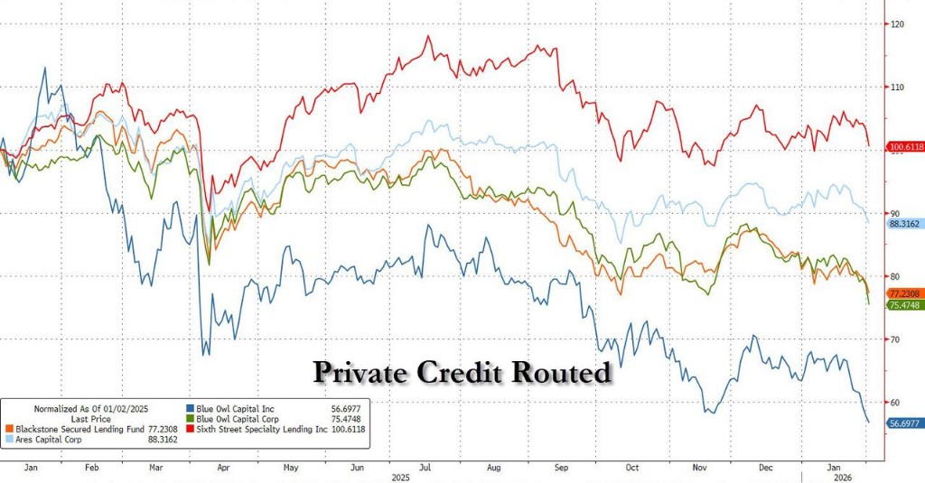 這種極端的情緒正在向下遊傳導。據彭博社報道,追蹤軟件股的一個指數在 1 月份暴跌了 15%,創下自 2008 年 10 月以來的最大月度跌幅。這種恐慌情緒直接衝擊了為軟件公司提供融資的私募信貸機構。