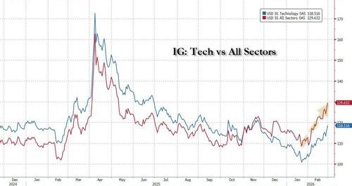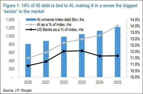 The investment-grade bond market, once seen as a safe-haven tool, is also showing rare cracks. According to JP Morgan data, companies related to AI currently account for 14% of the investment-grade index, with related debt rapidly swelling to $1.2 trillion, surpassing the U.S. banking sector to become the largest segment in the index. As the market comes under pressure, the spread between tech-related investment-grade bonds and the overall market index has significantly widened.