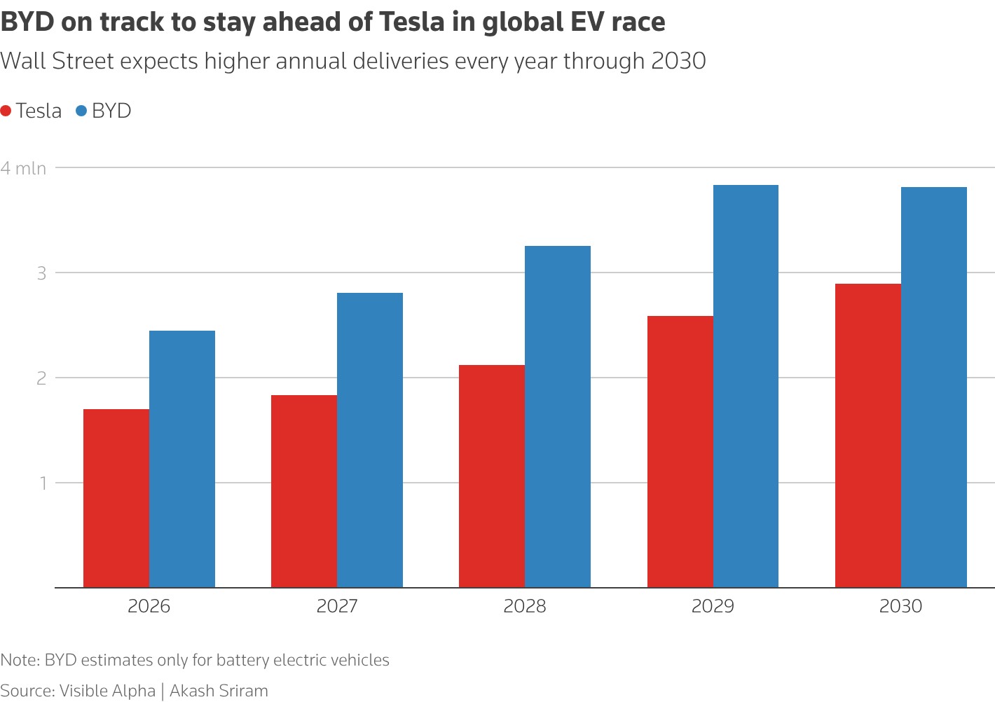 比亞迪在全球電動車競賽中有望繼續領先特斯拉