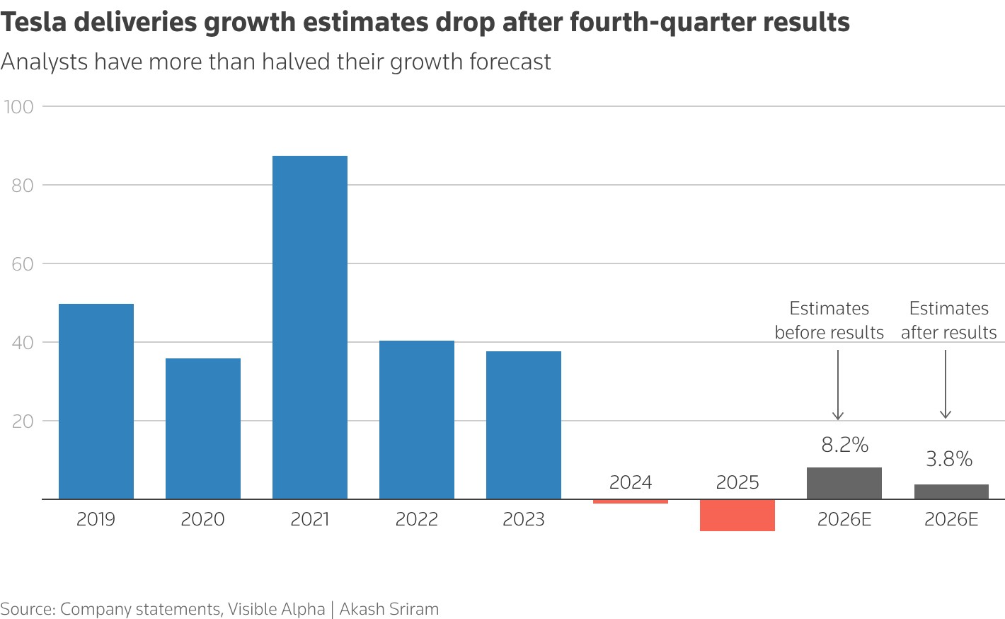 華爾街曾預計特斯拉將在 2026 年打破汽車銷售下降的趨勢,但這一預期正在迅速改變。分析師們將他們的增長預測從 1 月份的 8.2% 大幅下調至約 3.8%,一些知名的特斯拉觀察者,包括摩根士丹利和 Morningstar,現在預計將出現下降。