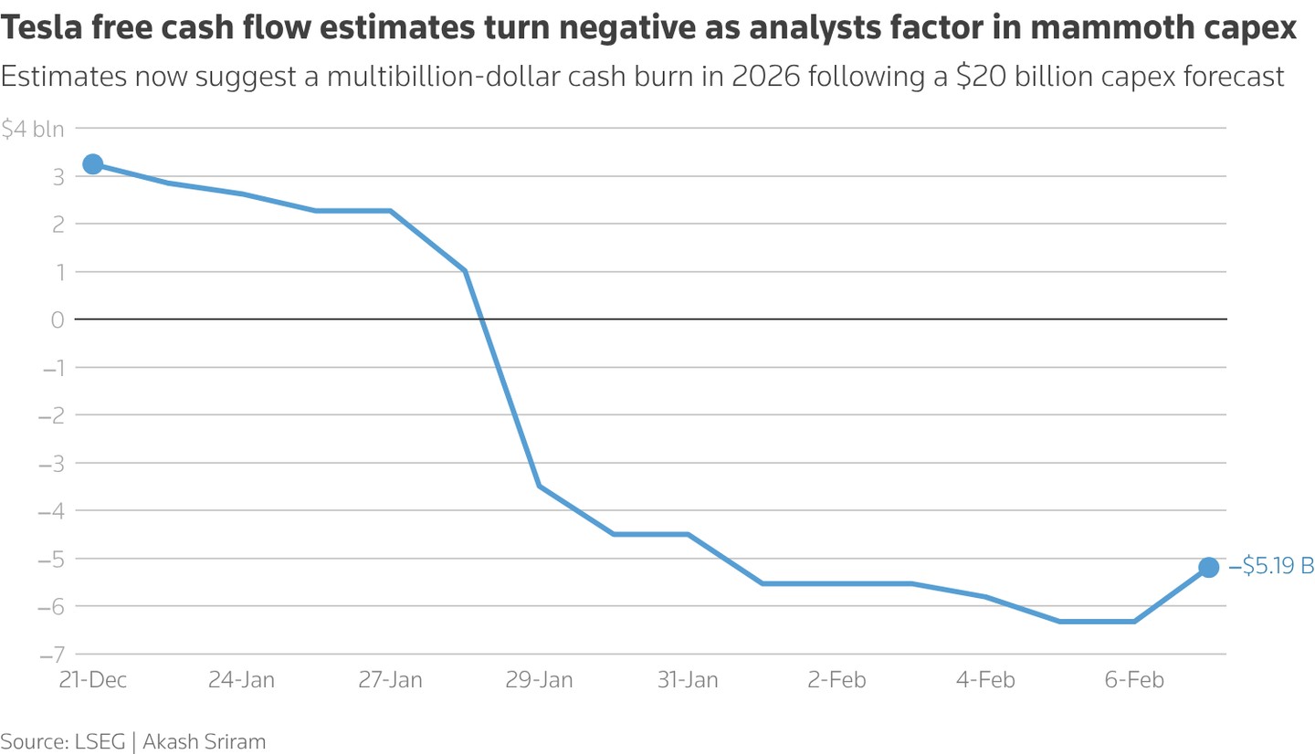 儘管特斯拉在自動駕駛、機器人和能源方面的雄心需要更高的資本支出,但現金消耗可能會對股價和公司的估值造成壓力,摩根士丹利分析師 Adam Jonas 在一份報告中表示。Jonas 預計公司在 2026 年將消耗超過 80 億美元的現金。