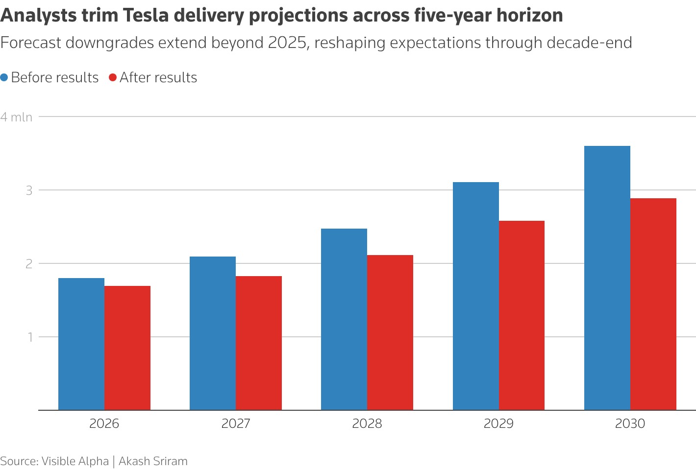 根據 Visible Alpha 的數據,2026 年的交付預期在最近幾個季度逐漸下調,最近幾個月的變化明顯,一些估計甚至指向明顯下降。