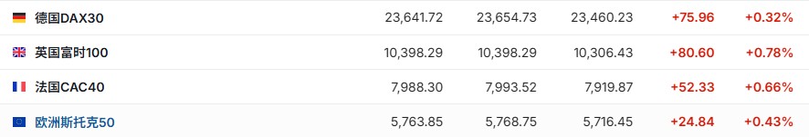 - As of the time of writing, the German DAX index was up 0.32%, the UK FTSE 100 index was up 0.78%, the French CAC 40 index was up 0.66%, and the Euro Stoxx 50 index was up 0.43%.