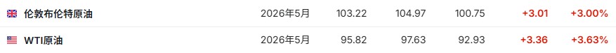 - As of the time of writing, WTI crude oil was up 3.63%, priced at $95.82 per barrel. Brent crude oil was up 3.00%, priced at $103.22 per barrel.