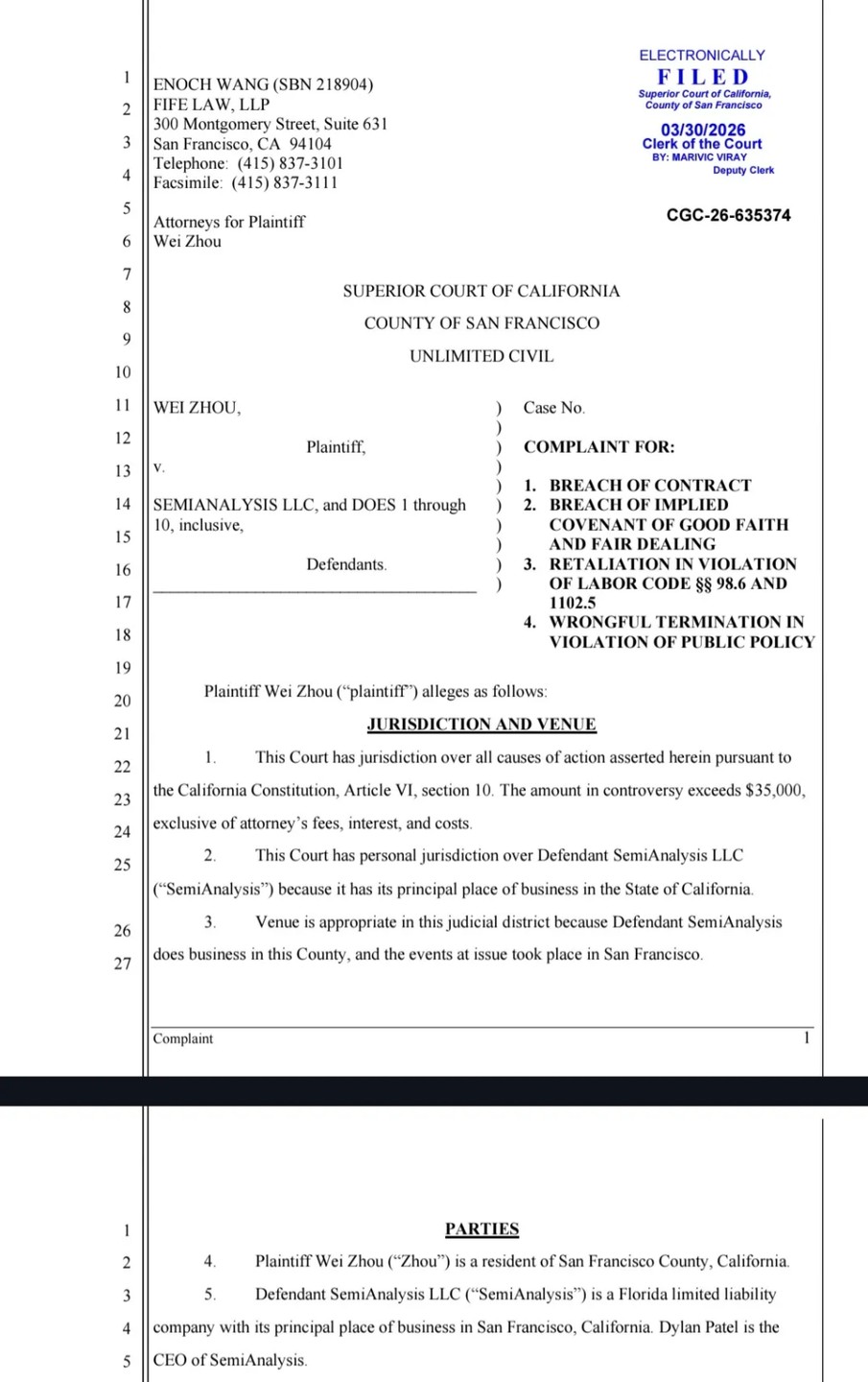 根據案號 CGC-36-635374 的訴訟文件,Wei Zhou 在訴狀中稱,其任職 SemiAnalysis 期間曾被要求將重大非公開信息納入公司向金融及半導體行業客户出售的行業分析模型。Zhou 以此舉可能違反相關法律為由拒絕執行,隨即遭到解僱,對公司系統的全部訪問權限也被立即撤銷。