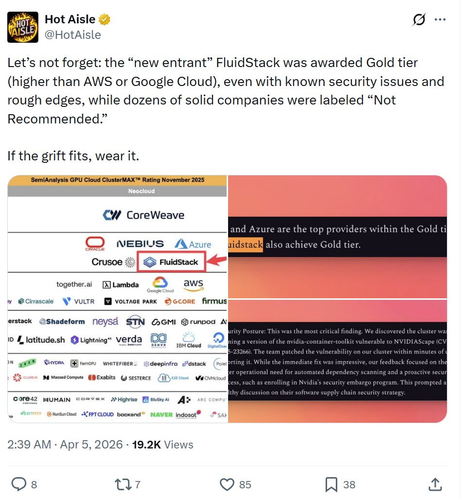 與此同時,社交媒體上已有獨立賬號 Hot Aisle“拿出了證據”。該賬號發帖指出,新進入者 FluidStack 在該系統中獲得了"金級"(Gold tier)認證,排名高於亞馬遜雲服務(AWS)和谷歌雲,而數十家經營穩健的公司卻被標註為"不推薦"——儘管 FluidStack 存在已知安全問題且產品功能仍不完善。該帖子暗指評級結果存在利益輸送之嫌。