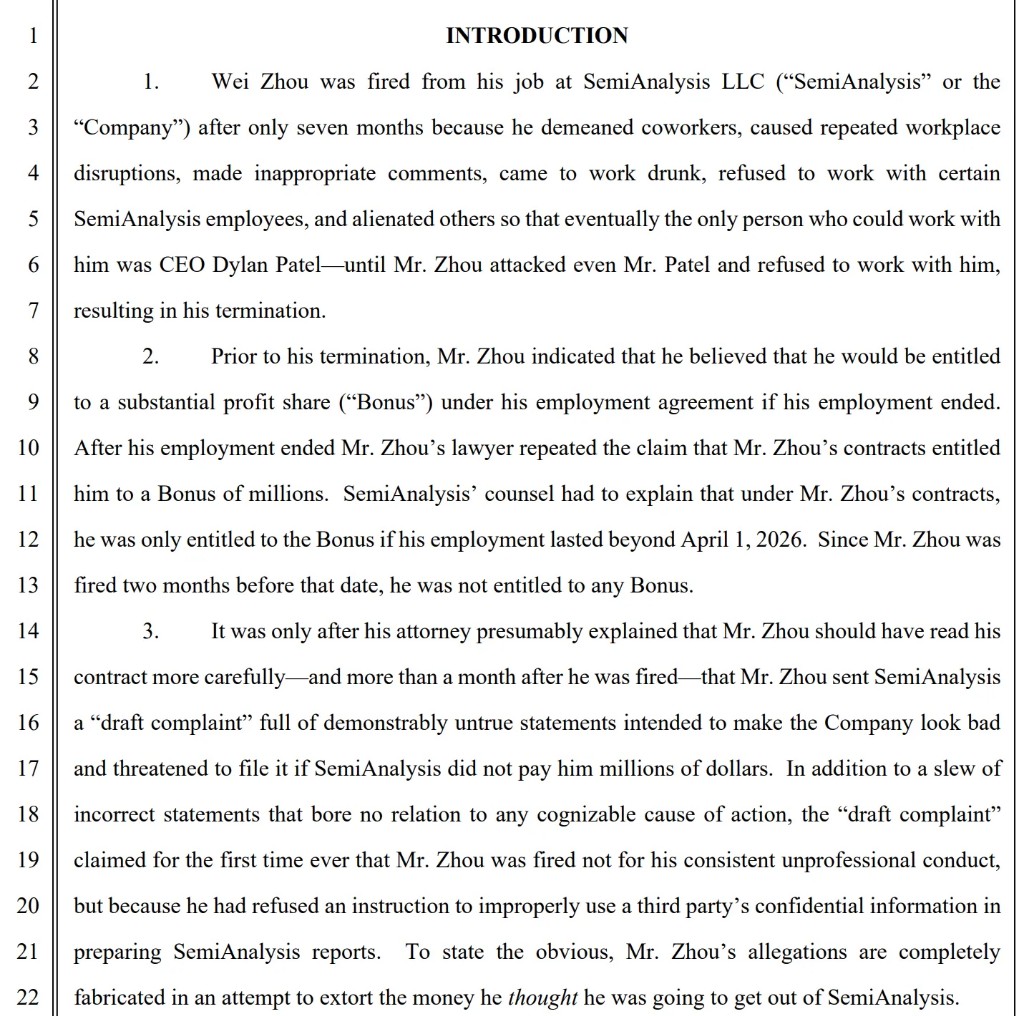 SemiAnalysis 在訴狀中稱,Zhou 因一系列嚴重不當行為於 2026 年 1 月被解僱,具體包括:帶醉意上班、對同事發表含有另一名員工姓名的不雅性暗示評論、拒絕與特定員工合作,以及多次擾亂工作秩序。公司還指控 Zhou 在離職後仍持有裝有公司商業機密的公司筆記本電腦,並向 SemiAnalysis 客户散佈誹謗性陳述。