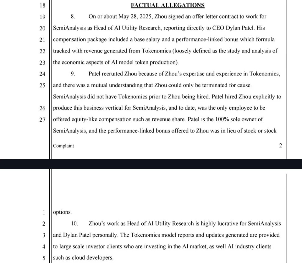 訴狀還披露,Dylan Patel 是 SemiAnalysis 的唯一所有人,公司不向員工提供任何股權或期權安排,收益分成因而屬於公司內部較為特殊的激勵機制。Zhou 在本次訴狀中暫未就上述收益分成單獨提出賠償請求。