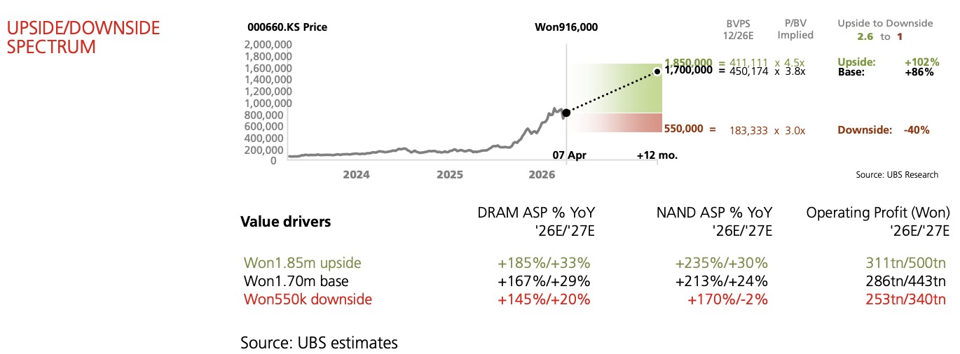 SK Hynix 在 HBM 領域佔據領導地位,瑞銀將其 12 個月目標價從 155 萬韓元上調至 170 萬韓元,同步大幅上調盈利預測:2026 年和 2027 年每股盈利預測分別較此前提升 22% 和 29%,2026 年運營利潤預測高達 286 萬億韓元,較市場一致預期高出約 57%。