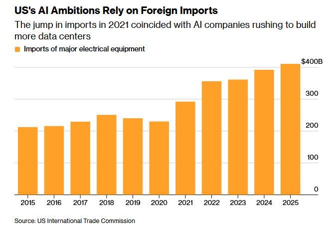 據彭博報道,美國國內製造產能無法跟上需求增速,建設方不得不大量依賴進口。GE Vernova 電氣化部門首席執行官 Philippe Piron 指出: