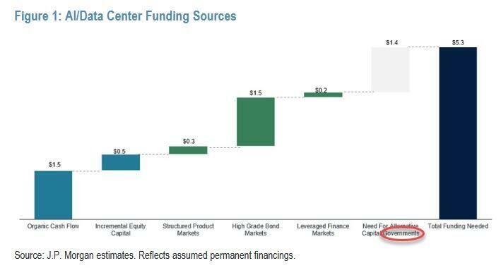 據摩根大通分析,完整支撐本輪 AI 週期所需資金規模不低於 5 萬億美元,即便考慮到科技巨頭的大規模資本開支與債務融資,美國政府仍需填補逾 1 萬億美元的資金缺口。