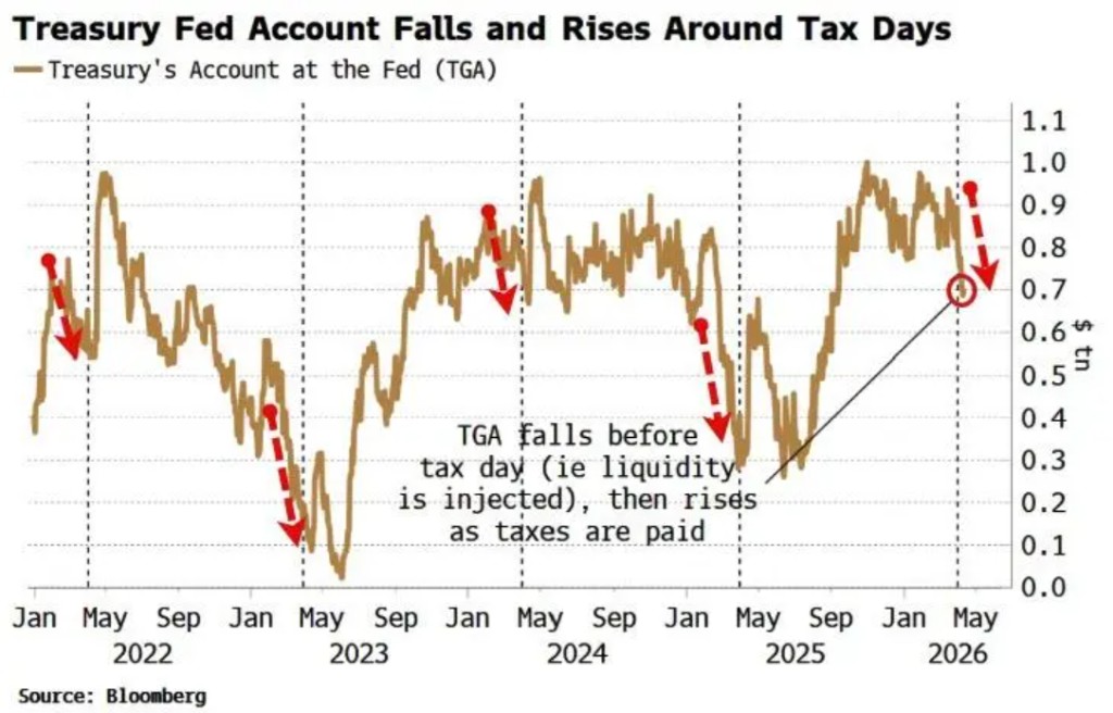 Around the tax deadline, the Federal Reserve actively conducts liquidity management. Typically, before the April deadline, the Treasury's account balance at the Fed decreases, meaning liquidity is injected into the market; after the deadline, as taxes are paid into government accounts, the balance rises accordingly.