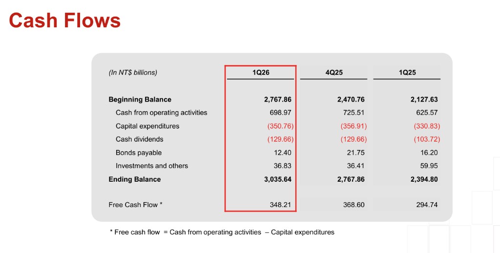 In terms of cash flow, operating cash inflow for the quarter was NT$69.897 billion, capital expenditure was NT$35.076 billion, resulting in free cash flow of NT$34.821 billion, up 18.1% year-over-year. Cash dividends paid amounted to NT$12.966 billion, with an ending cash balance (excluding securities) of NT$303.564 billion. The board has approved a cash dividend of NT$6.00 per share for Q4 2025, scheduled for distribution on July 9, 2026, continuing to return value to shareholders.