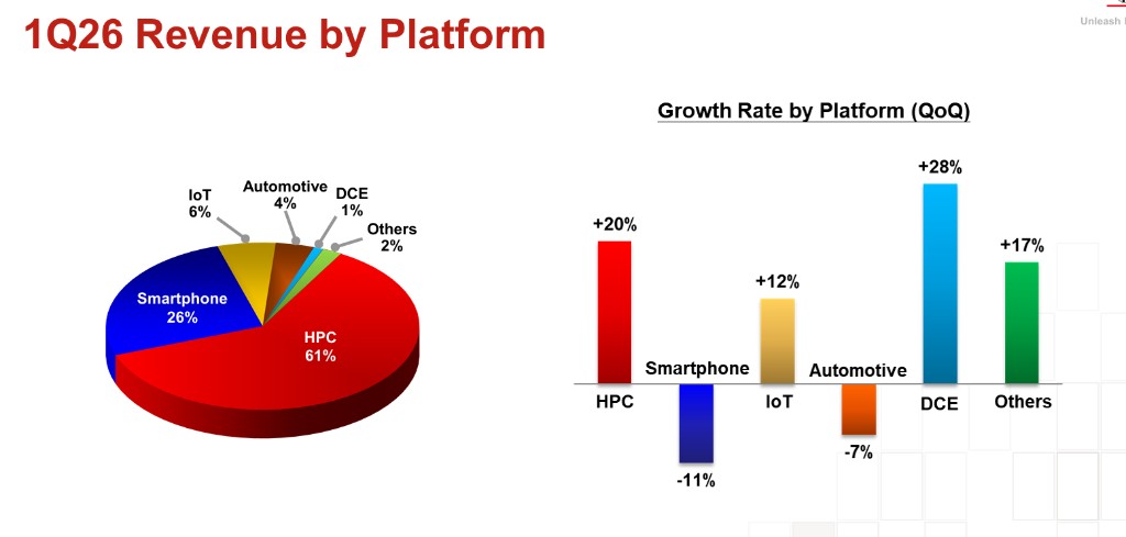 The smartphone platform ranked second with a 26% share, maintaining relative stability driven by flagship model inventory cycles. The IoT platform accounted for 6%, the automotive electronics platform for 4%, and DCE plus others combined for just 3%. Together, HPC and Smartphone platforms contributed approximately 87% of revenue. This highly concentrated structure indicates that Taiwan Semiconductor's revenue growth is deeply tied to the global AI investment wave.