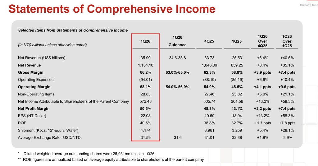 Gross margin expanded dramatically from 58.8% in Q1 2025 to 66.2%, a cumulative improvement of 7.4 percentage points. This was driven by multiple factors: continuous improvement in advanced process yields, full capacity utilization spreading fixed costs, premium pricing effects from advanced product mixes, and favorable short-term movements in the New Taiwan Dollar versus the US Dollar exchange rate (average rate of 31.59 this quarter versus 32.88 a year ago, an appreciation of approximately 3.9%).