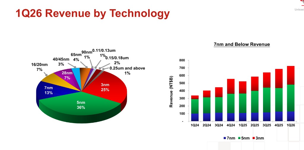 From the perspective of process technology, advanced nodes remain the core engine driving Taiwan Semiconductor's revenue. The 5nm process accounted for the highest share at 36%; the 3nm process followed closely at 25%. Together, processes at 5nm and below contributed over 60% of revenue, showing an accelerating growth trend—quarterly absolute revenue from 7nm and below processes nearly doubled from Q1 2024 to Q1 2026.
