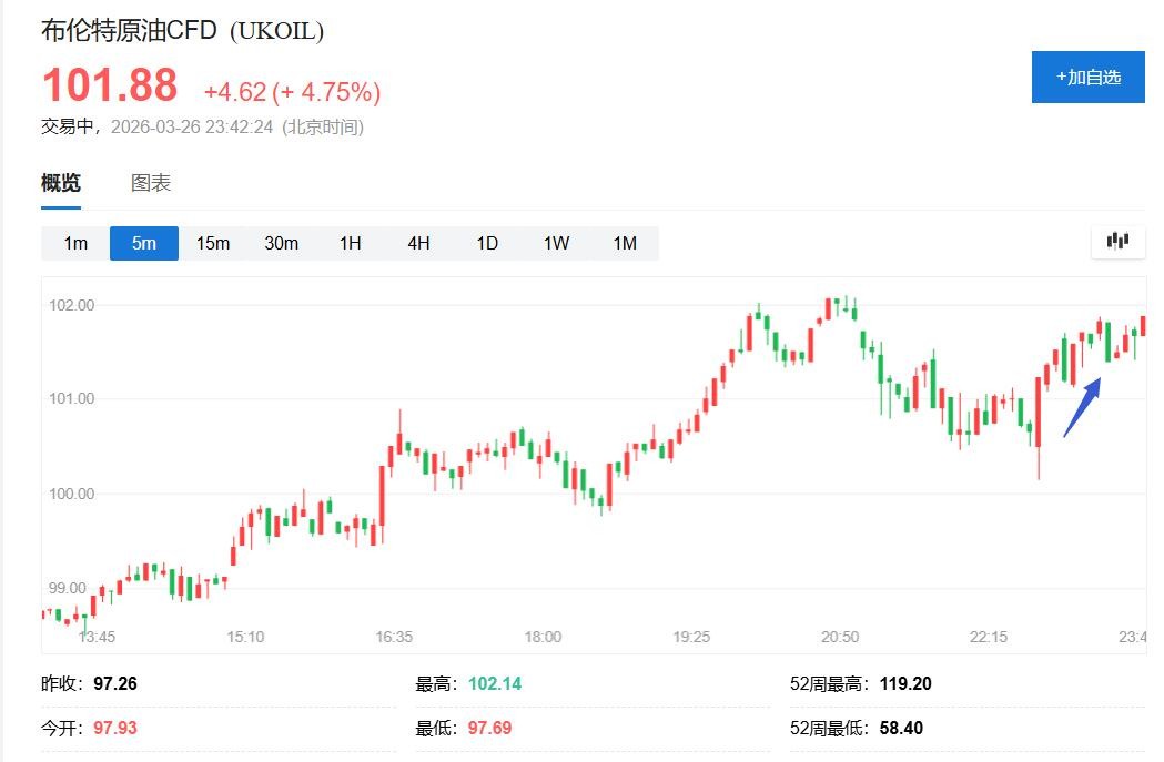 國際原油基準布倫特原油期貨重回 101.00 美元上方,日內漲幅再度擴大到 4% 以上。