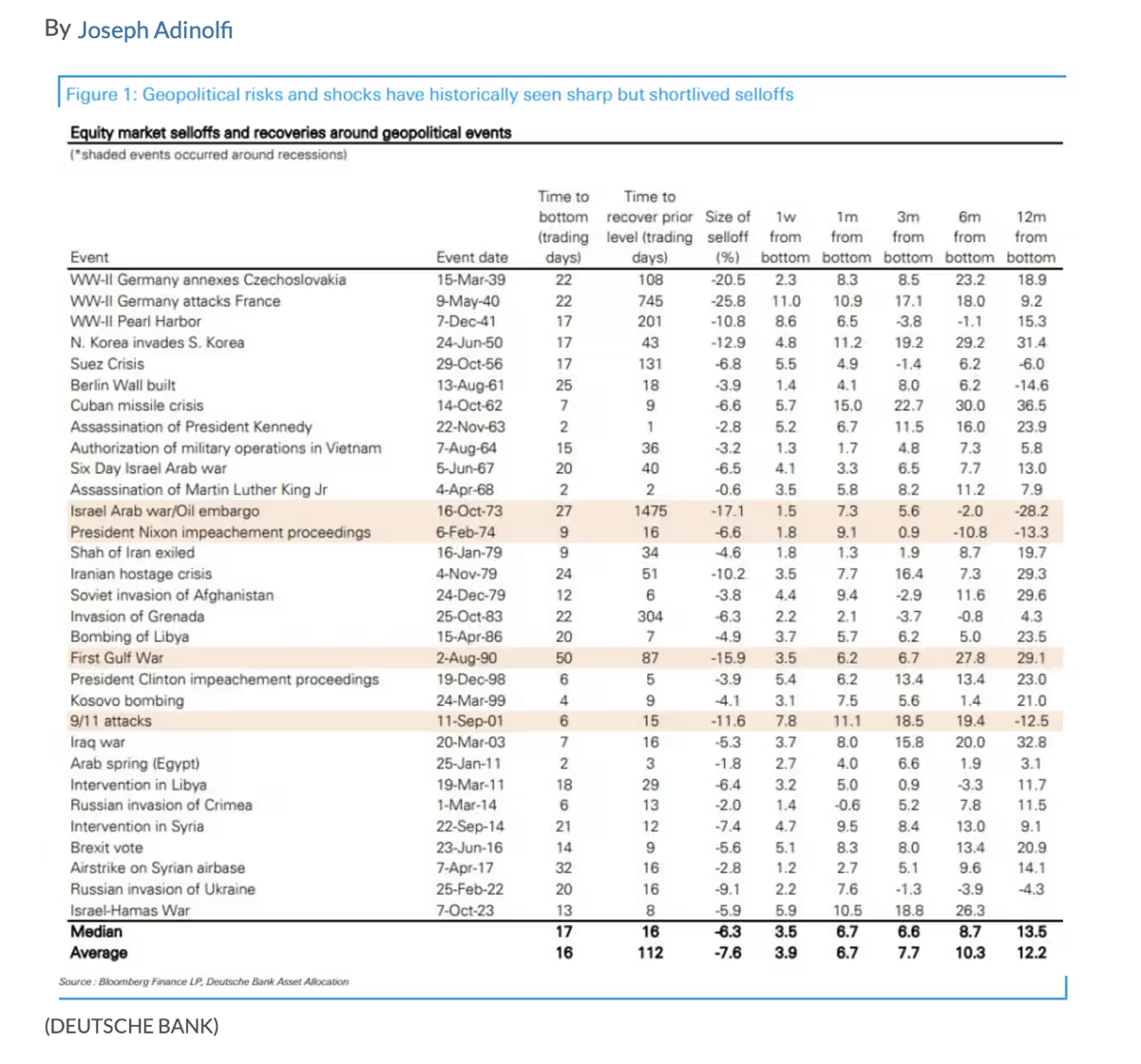 有分析指出,近年來(美國市場為例)地緣政治衝擊導致的股市下跌——平均跌幅約為 6%,而市場通常在 約 3 周 內反彈回原位。